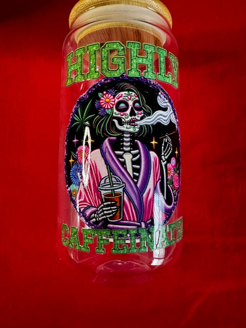 Highly Caffeinated 16 oz glass tumbler with lid and straw